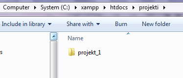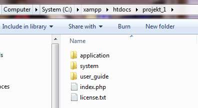 Nakon toga kopirajte mapu “application” iz raspakirane “Codeigniter_2.1.0.zip” arhive u mapu “C:\xampp\htdocs\projekti” tako da imate “C:\xampp\htdocs\projekti\application” i preimenujte “application” direktorij u “projekt_1” kako je prikazano na slici: